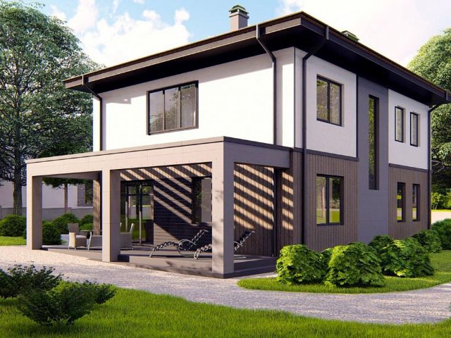 Проект современного одноэтажного дома "Аврора 6" в скандинавском стиле с двумя открытыми террасами, террасой-барбекю, сауной и навесом для автомобиля. Площадь дома - 309,03 кв.м.